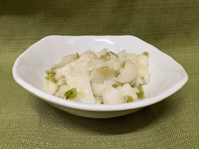 程よい脂のりとプリプリ食感のカラスかれいのエンガワをわさび味の塩辛に仕上げました。
